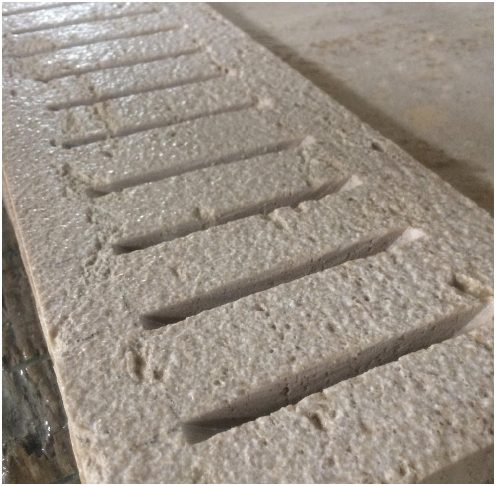 10.05.2017Işlenmiş hafif traverten kaplama ve su tahliye kanalları:Su tahliye kanalları çekiçleme (mucarta) plakalardan yapılmıştır. Kanallar için plakaları 20x100x3cm boyutunda kesiyoruz ve havuz kaplamaları için 30x100x3cm boyutunda kesiyoruz. Havuzlar için suya karşı dayanıklılık açısından traverten en iyi seçenektir. Çekiçleme (mucarta) yüzeyler kaymayı önlemek için kullanılır.