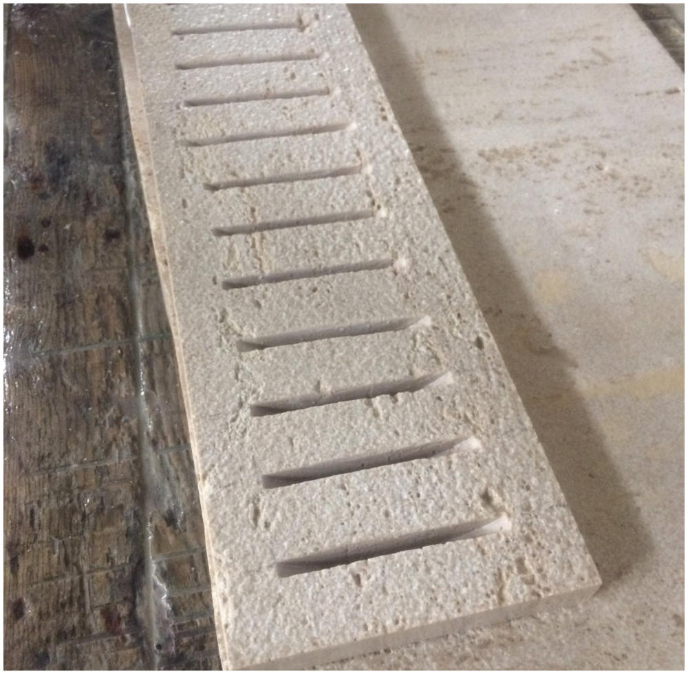 10.05.2017Işlenmiş hafif traverten kaplama ve su tahliye kanalları:Su tahliye kanalları çekiçleme (mucarta) plakalardan yapılmıştır. Kanallar için plakaları 20x100x3cm boyutunda kesiyoruz ve havuz kaplamaları için 30x100x3cm boyutunda kesiyoruz. Havuzlar için suya karşı dayanıklılık açısından traverten en iyi seçenektir. Çekiçleme (mucarta) yüzeyler kaymayı önlemek için kullanılır.